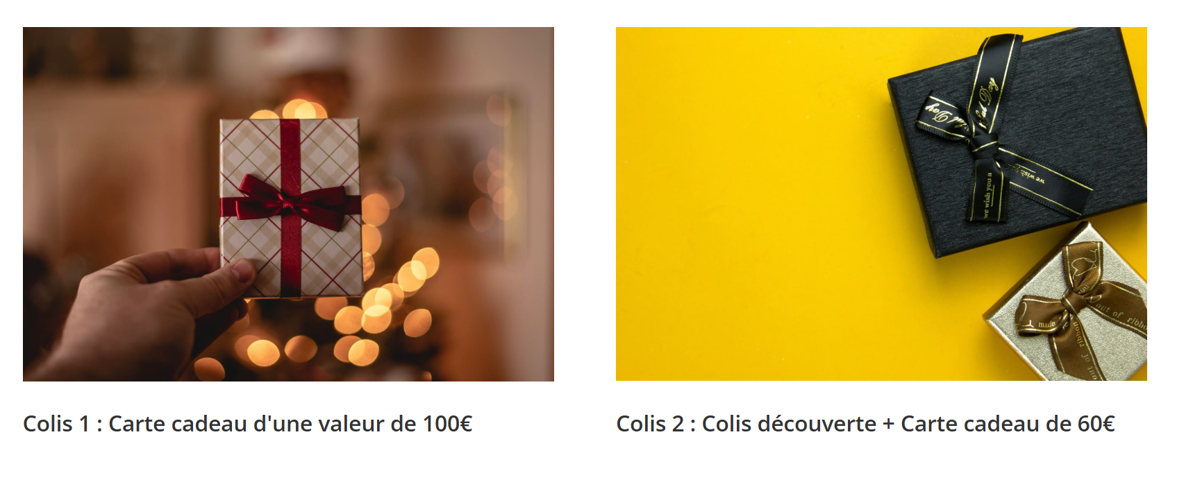 Colis de Noël Choisissez votre colis de Noël Mes avantages CSE Bon sport Colis de Noël Chèque vacances Contenu des colis Choisir mon colis Demande à effectuer du 2 Octobre au 30 Octobre Nom et prénom *Adresse email *Choix du colis *Choisissez votre colisColis 1 : Carte cadeau de 100€Colis 2 : Coffret découverte + Carte cadeau de 60€Envoyer